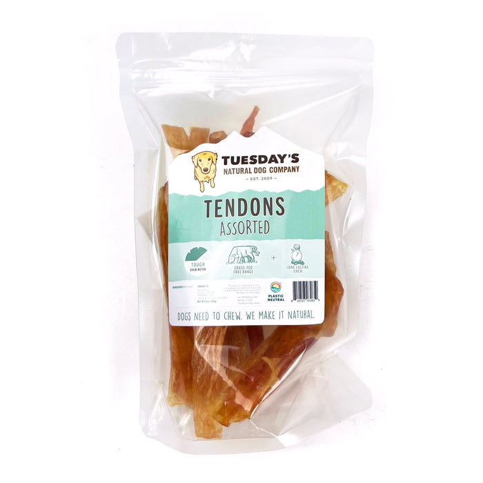 Description: There are 8 ounces of beef tendons in assorted sizes in each bag. Each tendon will vary in size, length, and shape. Some pieces will be skinny, large, or chunks. Due to the size difference of each piece, there will be variations in the total amount of tendons per bag.
